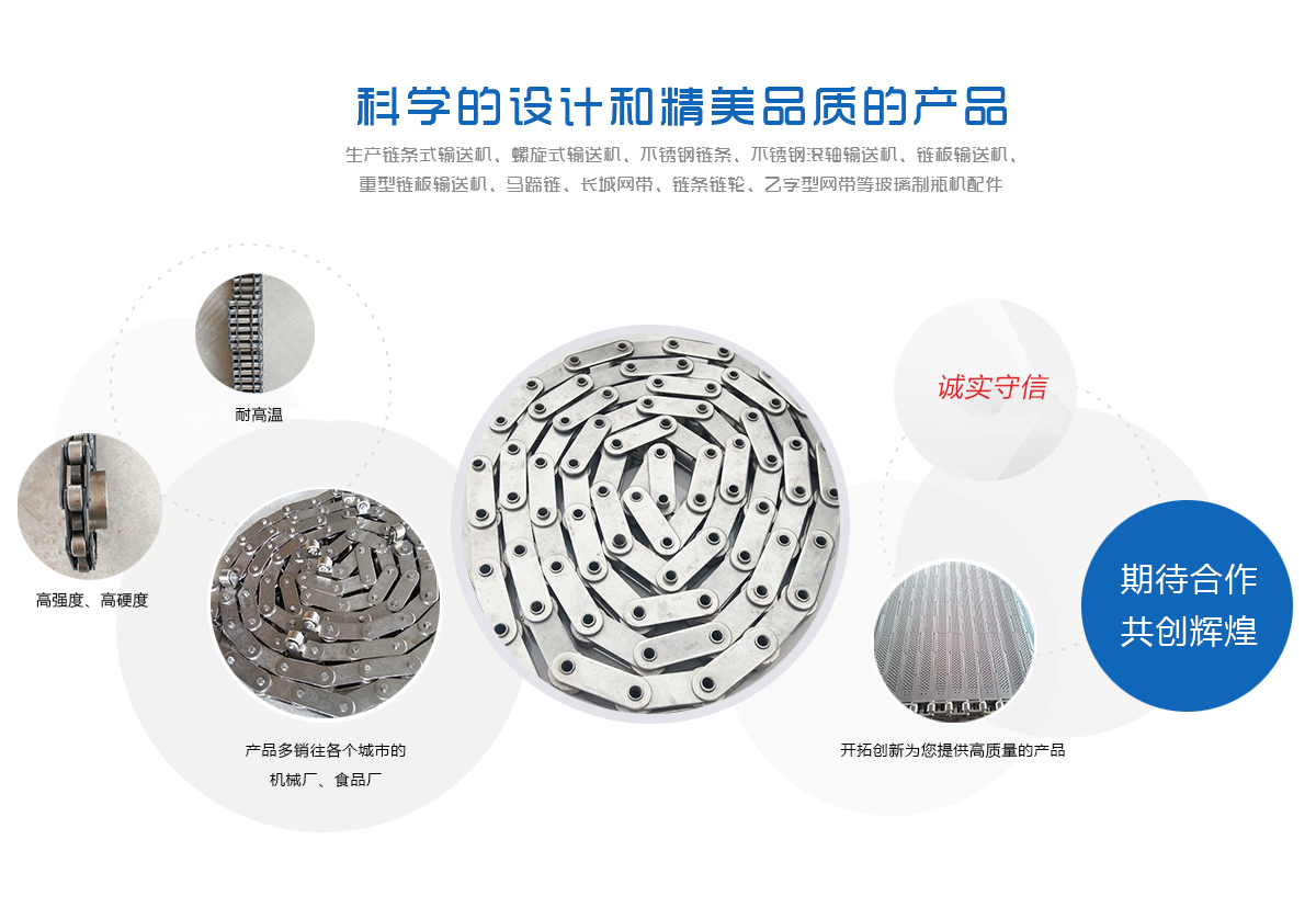 生產(chǎn)鏈條式輸送機(jī)、螺旋式輸送機(jī)、不銹鋼鏈條、不銹鋼滾軸輸送機(jī)、鏈板輸送機(jī)、重型鏈板輸送機(jī)、馬蹄鏈、長城網(wǎng)帶、鏈條鏈輪、乙字型網(wǎng)帶等玻璃制瓶機(jī)配件,食品機(jī)械配件及各種網(wǎng)帶的專業(yè)廠家 ,多年來產(chǎn)品暢銷各地玻璃廠和食品廠,在玻璃制品等行業(yè)中享有較高的聲譽(yù)。公司集摸具開發(fā)、機(jī)械設(shè)計(jì)生產(chǎn),銷售于一體的生產(chǎn)型企業(yè)。生產(chǎn)的自動化流水線金屬傳動網(wǎng)帶、鏈條等產(chǎn)品廣泛用于玻璃機(jī)械、食品機(jī)械、化纖機(jī)械、醫(yī)藥、電子、烘干機(jī)械、輪胎機(jī)械等行業(yè)。產(chǎn)品多銷往各個(gè)城市的機(jī)械廠、食品廠和一些涉及流水線或自動化設(shè)備的公司。